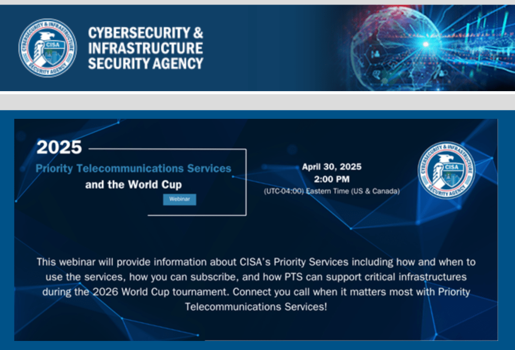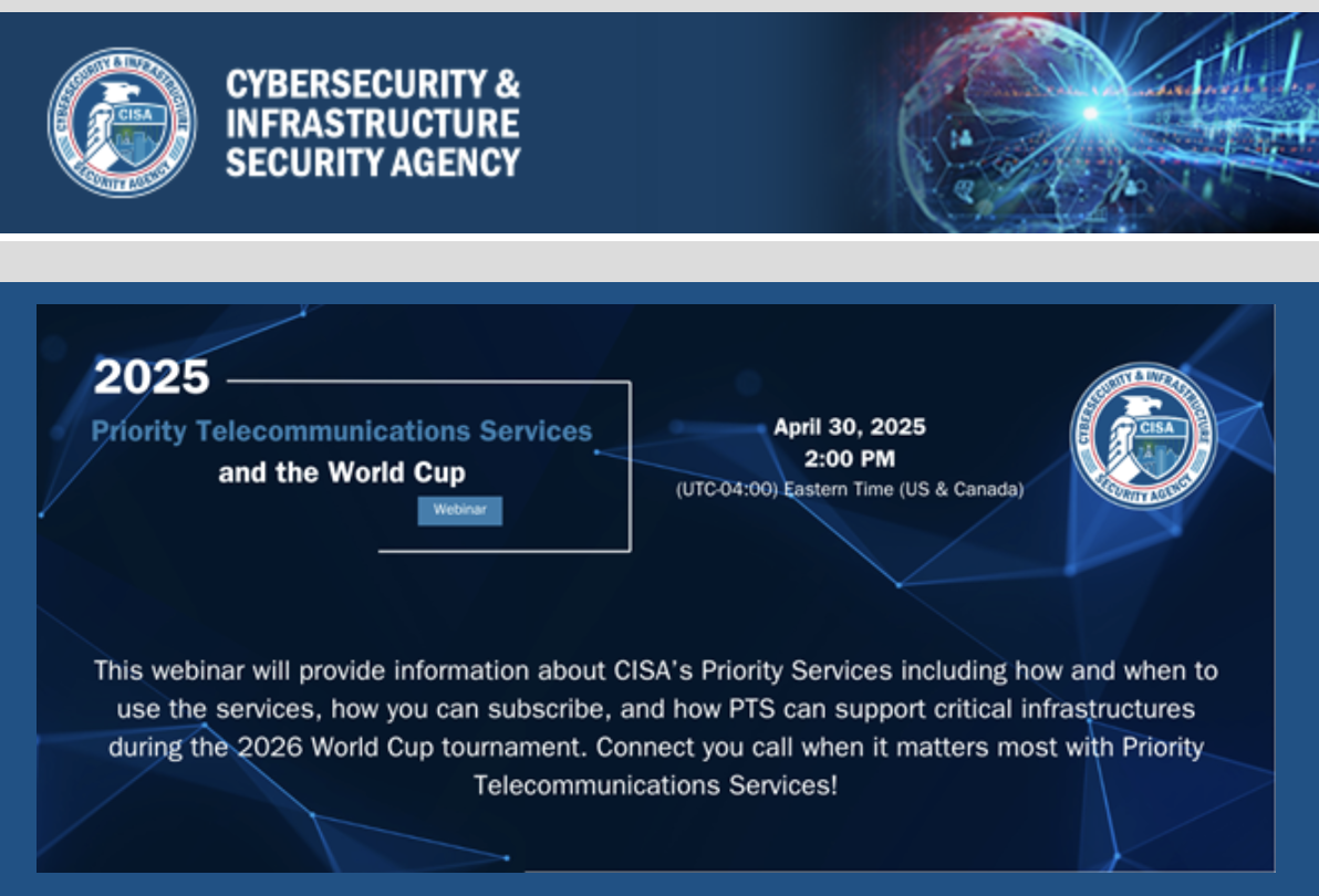 Join the Cybersecurity and Infrastructure Security Agency (CISA) as we close out Emergency Communications Month with an educational webinar! This webinar will provide information about CISA’s Priority Telecommunications Services (PTS) including how and when to use the services, how you can subscribe, and how PTS can support critical infrastructure during the 2026 World Cup tournament. Connect your call when it matters most with CISA’s PTS!