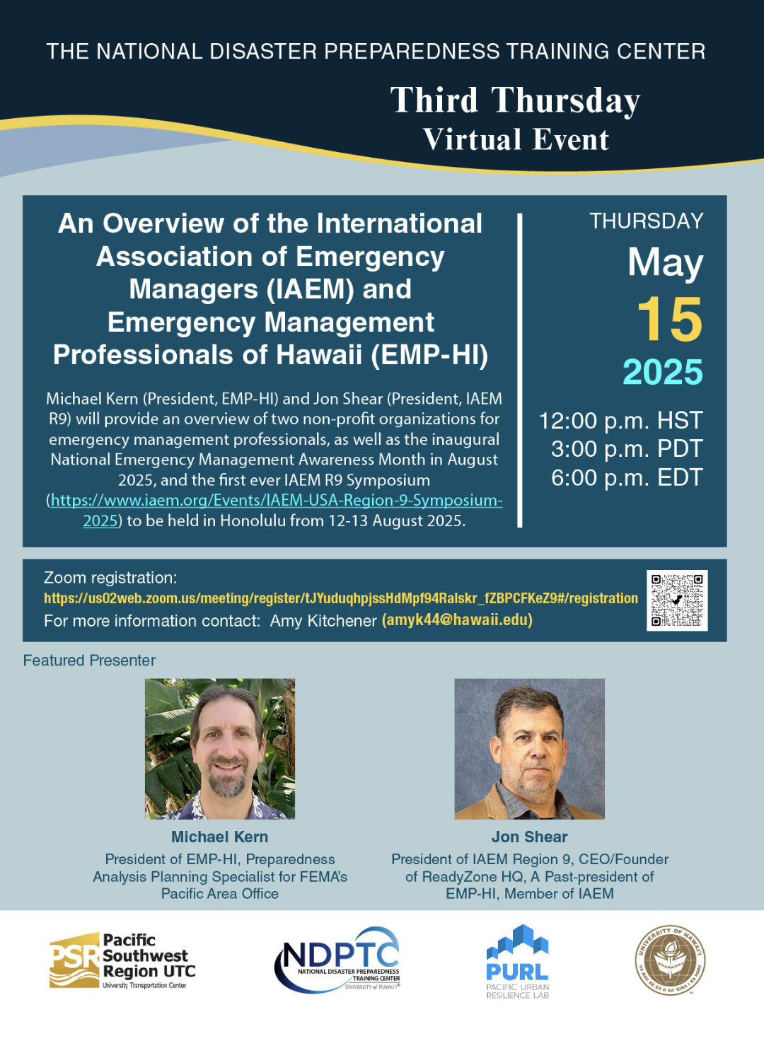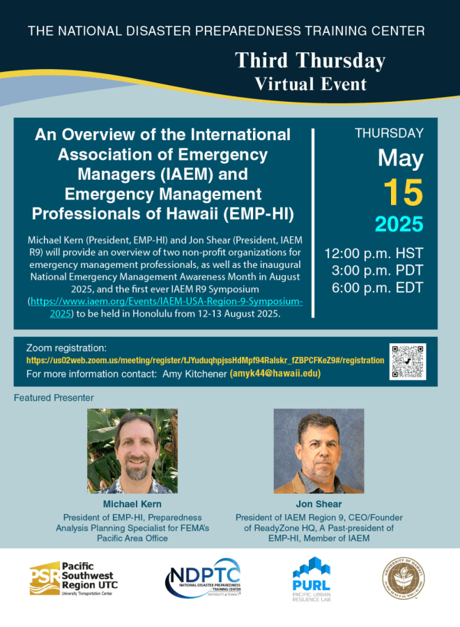 🧑‍💻About the Webinar: The presenters will provide an overview of two non-profit organizations for emergency management professionals, as well as the inaugural National Emergency Management Awareness Month in August 2025, and the first ever IAEM R9 symposium to be held in Honolulu from August 12th – 13th, 2025.