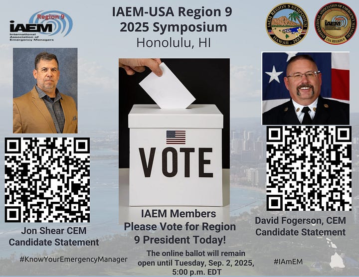 - How to Vote: Check your email for your personalized voting link from IAEM and visitĀ https://www.iaem.org/council/usa/elections/IAEM-USA-Council-Officers-ElectionĀ andĀ https://www.iaem.org/council/usa/elections/IAEM-USA-Region-9-Officers-ElectionĀ to learn more. See below for the candidates for IAEM-USA Region 9 and IAEM-USA 2nd Vice President we shared during our recent IAEM-USA Region 9 Symposium in Honolulu, HI encouraging members to vote (NOTE:Walter English, III, CEM, is running unopposed for IAEM-USA Treasurer).