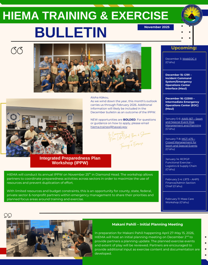 Member, Niea Gardner shared the attached HIEMA training newsletter and the good news that FEMA independent study courses are back online after the shutdown.