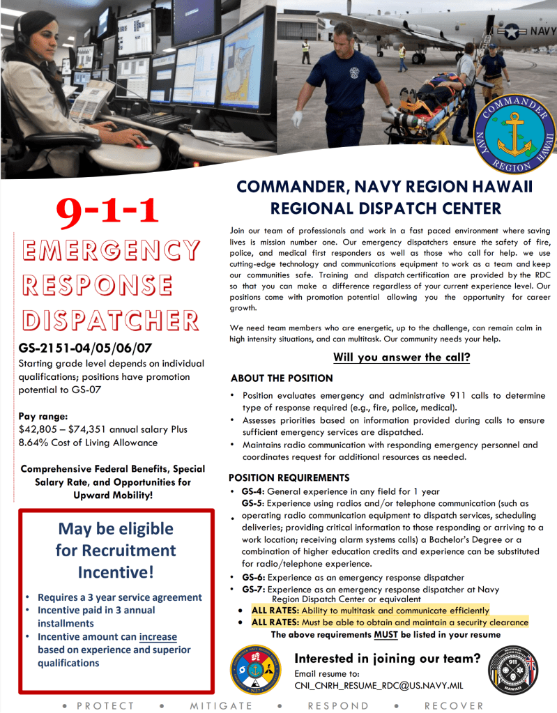 Member, Will Luna shared the attached recruitment for 911 dispatch jobs with the Navy Region Dispatch Center
