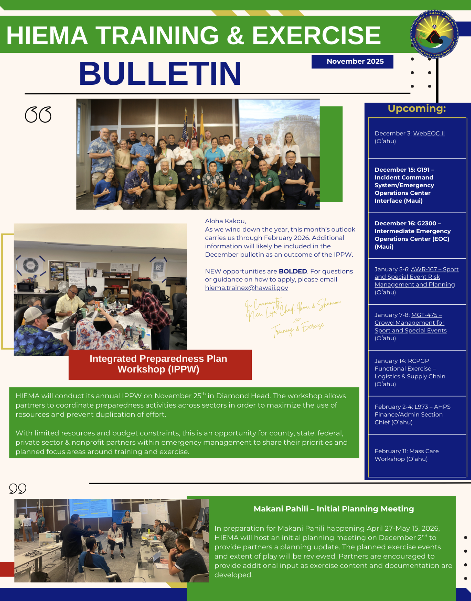 Member, Niea Gardner shared the attached HIEMA training newsletter and the good news that FEMA independent study courses are back online after the shutdown.